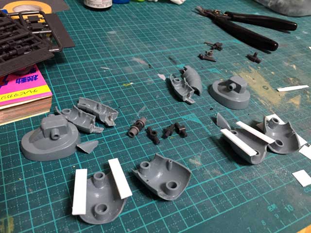 各パーツを工作していく訳ですが、今回のテーマの一つに色ごとにパーツを分けてみようというのを取り入れることになりまして、やめておけばいいものをものすごい勢いで切り刻み始めました。すでに胴体がバラバラ状態だったので怖いものなしなんですよ!